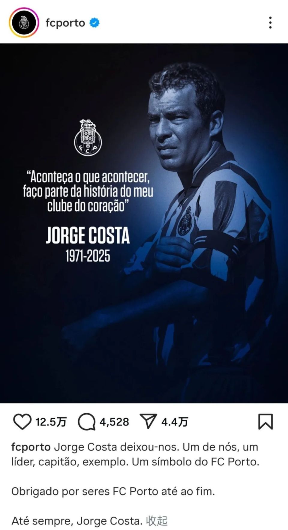 IM电竞葡萄牙足球俱乐部波尔图发文:“若热·科斯塔离开了我们。他是我们中的一员,是领袖,是队长,是榜样。他是波尔图足球俱乐部的象征。感谢一直支持波尔图俱乐部。再见,若热·科斯塔。”