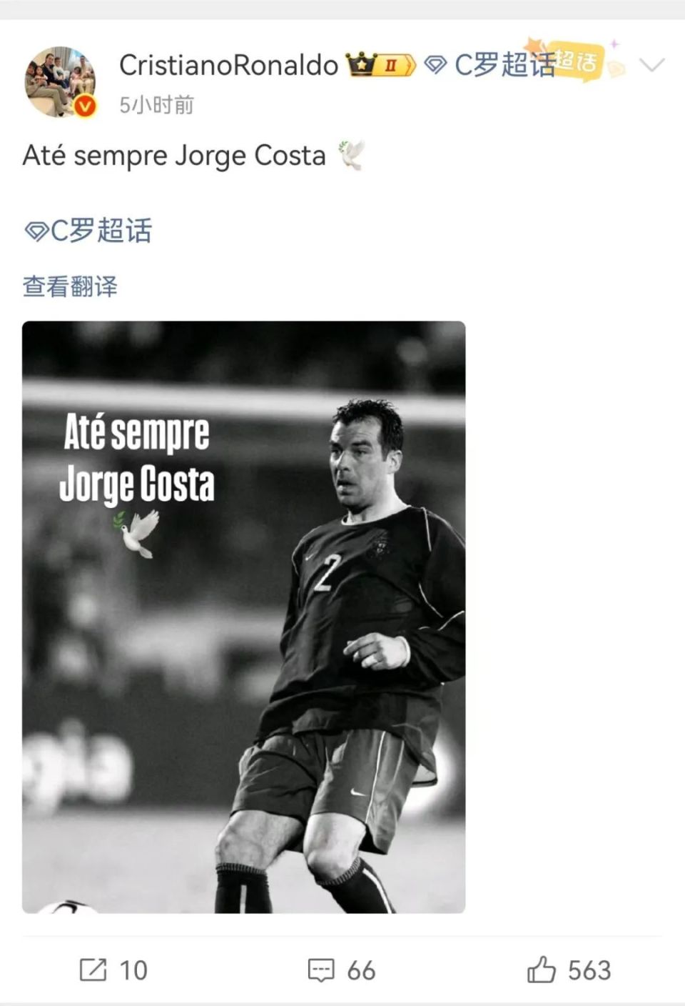 科斯塔去世后,著名足球运动员克里斯蒂亚诺·罗纳尔多在微博上发文悼念“永别了,若热·科斯塔”。